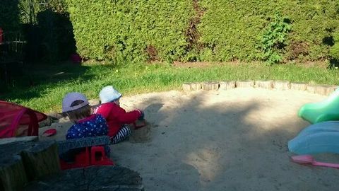 Im Garten wurde ein großer Sandkasten mit Motorik-Elementen professionell angelegt.